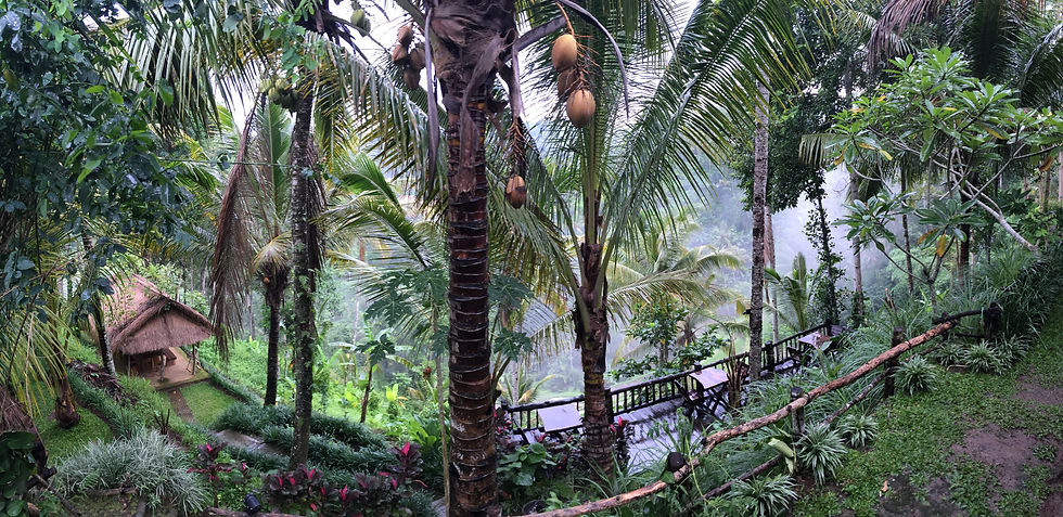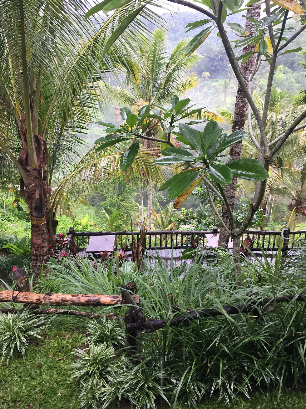 Ano opět prší a jsme rádi, že jsme autem. Déšť pokračuje a my se přesouváme dál hledat známé překrásné výhledy na rýžová políčka. Déšť neustává a tak podle reklamního panelu slibujícího krásný výhled a dobré jídlo zastavujeme u další restaurace. S kýčovitými, zapůjčenými deštníky vstupujeme do další oázy klidu. Perfektní výhled, nádherné posezení a skvělá atmosféra. Jelikož stále prší dáváme si kávu a relaxujeme. Tohle počasí má svou skvělou nezaměnitelnou atmosféru. Byli jsme rádi že prší! Užívali jsme si to! Po pár hodinách déšť ustal a my se vydali na malý průzkum okolí. Překrásné údolí s rýžovýmí terasami, do nebe se tyčícími palmami a mlhovým oparem, připominájící před chvílí utišený déšť.
