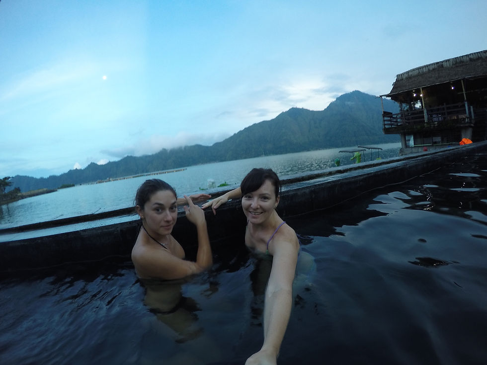 Opouštíme místo spokojeně zrestaurováni a po prodiskutování co dále s načatým dnem pokračujeme po krkolomných cestičkách směrem na sever. Našim cílem je jezero pod sopkou. Stoupáme a teplota pomalu klesá. V dálce vidíme majestátnou sopečnou horu a po další hodinové cestě se dostáváme k Batur Natural Hot Spring - termální bazénky. Přicházíme však poměrně pozdě a u kasy nám hlásají že je půl sedmé a oni v sedm končí. Po tak dlouhé cestě si říkáme, že nahlédneme aspoň dovnitř a pak se rozhodneme. A tak se vracíme zalatit vstupné zahrnující osvěžující nápoj z melounu a smažený zelený banán k tomu. Převlekli jsme plavky a uvelebili jsme se ve vodě. Slunce pomalu zapadá a nastává tma prozářená měsíčním svitem se spoustou hvězd na nebi. Je to paráda. Návštěvníci postupně odcházejí a my zůstaváme v bazéncích sami. Teplé prameny jsou opravdu příjemné a tak spokojeně odcházíme o půl deváté.