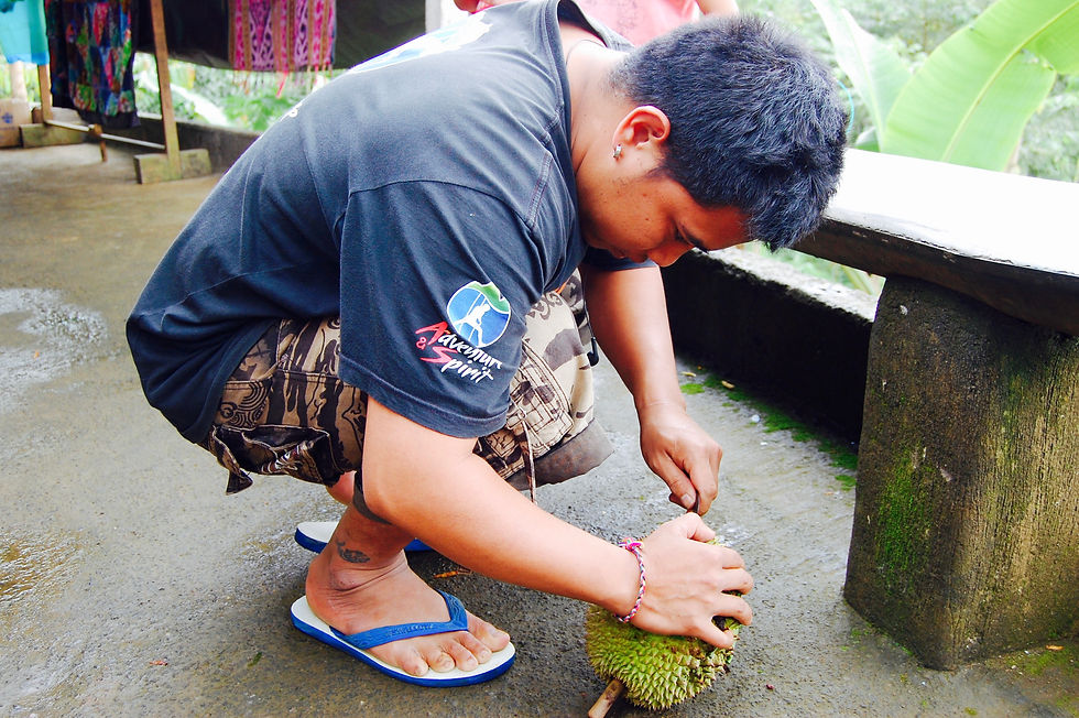 Tyto rozlehlé přírodní skvosty jsou obklopeny tropickou zelení. Přírodní, čistá voda protéká všude okolo. Je to asi jedno z mála míst na Bali, kde najdete pitnou vodu volně v přírodě, neznečištěnou plasty a nekontaminovanou splašky. Plnými doušky jsme se napili, protože jinak je zde pitná voda v barelech, která je upravovaná ionizací a tudíž se jedná o takzvanou mrtvou vodu a není zas až tak chutná (po dlouhodobé konzumaci). Během prohlídky lehce sprchlo. Zastavili jsme se u jednoho stánečku s občerstvením a během deseti minut bylo po dešti a mohli jsme pokračovat v prohlídce dál. Vodopády nádherné. Průvodce vybízel ke koupání v jezírku pod vodopádem s vodou o teplotě 15 stupňů, my jsme ale s úsměvem odmítli. Po cestě zpátky, jsme ochutnali durian. Závan totiž naznačoval že jeden již zralý kousek spadl. Průvodce pohotově se porozhlédnul po spadlém plodu a nabídl ochutnávku tropického ovoce. Jelikož za celou dobu co jsme tady jsme ještě nenašli odvahu tuto ovocnou specialitku ochutnat, kývli jsme. Závan jako ze zkažených vajec a chuť ne o moc lepší. Do tvrdé ostnaté slupky se hůře dostává. Jedlý plod je usazen uvnitř a obsahuje ještě pecku. Skupenství poněkud mazlavé, chuťově se dá přirovnat k cibuli. Nic na čem bychom si pošmákli. Stačilo ochutnat a už ne více. Plody durianu jsou silným detoxikantem a zároveň je nesmí požívat těhotné ženy, tak pozor!