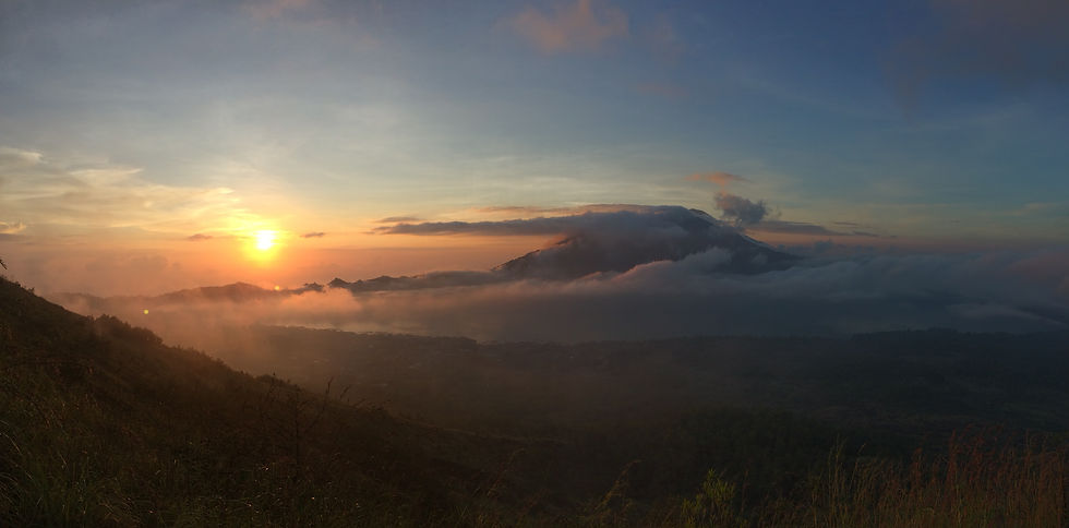 Nahoře bylo pod mrakem, chvíli to vypadalo že nic neuvidíme. Už jsme se otočily, že se vydáme na cestu zpět, v zápětí se mraky roztrhaly a my jsme spatřily náš první východ slunce na Bali. Zážitek je to opravdu nezapomenutelný, umocněný námahou a radostí z výstupu. Samozřejmě následovala fotochvilka se štastnými výletníky. Poté jsme se prošly vulkánem, zbylé svačinky věnovaly opicím a vydaly se na cestu dolů. Stejnou trasou již za plného světla to vypadalo zběsile. Hledáme kam dát nohu strmé klesání ve skalní pěšině se "schody" i několik desítek centimetrů, navlhá skála s pískem a kamením klouže. Připadáme si jako kamzíci. Jdeme opatrně dolů. Předbíhají nás mladí obchodníci s prázdnými batůžky. Po hodině jsme dole u našeho auta a řidiče. Ten nás netrpělivě nakládá a pokračujeme dále.