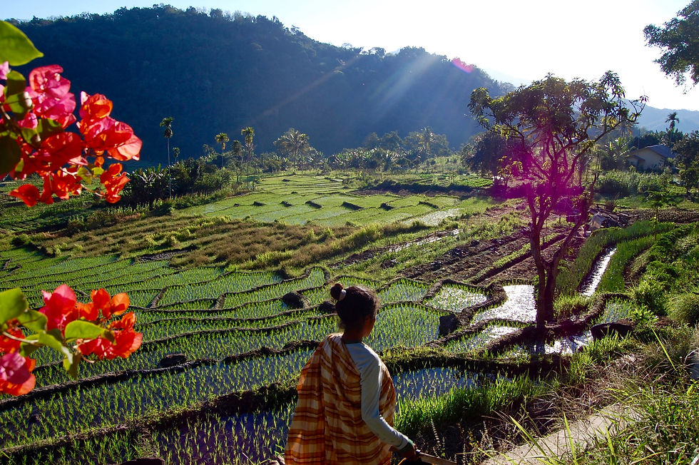Budíček na 4 hodiny ráno. Řidič i se snídaňovým balíčkem nás čeká na cestě. Je oblečený, jako my když venku nastane zima. Po hodinové cestě kopcovitým terénem se vydáváme ze záchytného parkoviště vzhůru za svitu měsíce. Po krátkém stoupání dovršíme vrchol Kelimutu s vyhlídkou na všechny tři jezera a s dohledem na moře. Ještě je příliš časně, ale vyhlídka se už plní a v dálce na východní straně je vidět ohromná červená záře. Všichni nastavují foťáky a kamery a vyčkávají na velkolepý příchod sluníčka. To s postupným stoupáním vytváří neuvěřitelnou světelnou podívanou. Fotoaparáty cvakají a na obloze se objevuje nyní velmi oblíbená a snadno dostupná technologická vychytávka dron. Zvuk vrtulek je docela rušivý element a omezuje kompozici fotografií. Odebíráme se nazpět. Budíme řidiče a cestou dolů zastavujeme na okrajích silnice, kde lovíme krásné památeční záběry. Rozprostírá se před námi výhled na nádherná malinká rýžová pole. Poslední zastávkou jsou takzvané hot springs. Představa teplých pramenů v nás vyvozuje teplé koupací bazénky. Plavky i ručník máme s sebou, jen ta přístupová cesta je nějaká divná. Po hranicích rýžových polí sestupujeme terasami dolů, několikrát se ještě otáčím a ujišťuji se o správném směru cesty. Dole se už spokojeně koupou a drhnou drobní lidé s chybějícími zuby. To na koupání pro nás moc nevypadá. Jdeme pomalu po hrázích. Mě se ale naneštěstí zaboří noha do hlubokého bláta. Leknutím heknu a všichni ve vodě reagují politováníhodným oooooch. Zouvám zablácené tenisky a po lýtka vcházím do teplého 100% přírodního bazénku fungujícího jako pračka a umyvadlo dohromady. Probíhá tady očista těla, drhnutí zubů kartáčkem a praní špinavého prádla. Voda neustále přitéká a proto je jezírko průzračně čisté. Pán z vody mi podává kartáč a mýdlo, aby jsem si, teď už hnědé, tenisky vydrhla. Po chvilce snažení jsou boty opět zářivě modré a vypadají jako nové. Přicházejí další průzkumníci a ptají se mě jestli tady žiji … nejspíše zapadám do místního koloritu života.